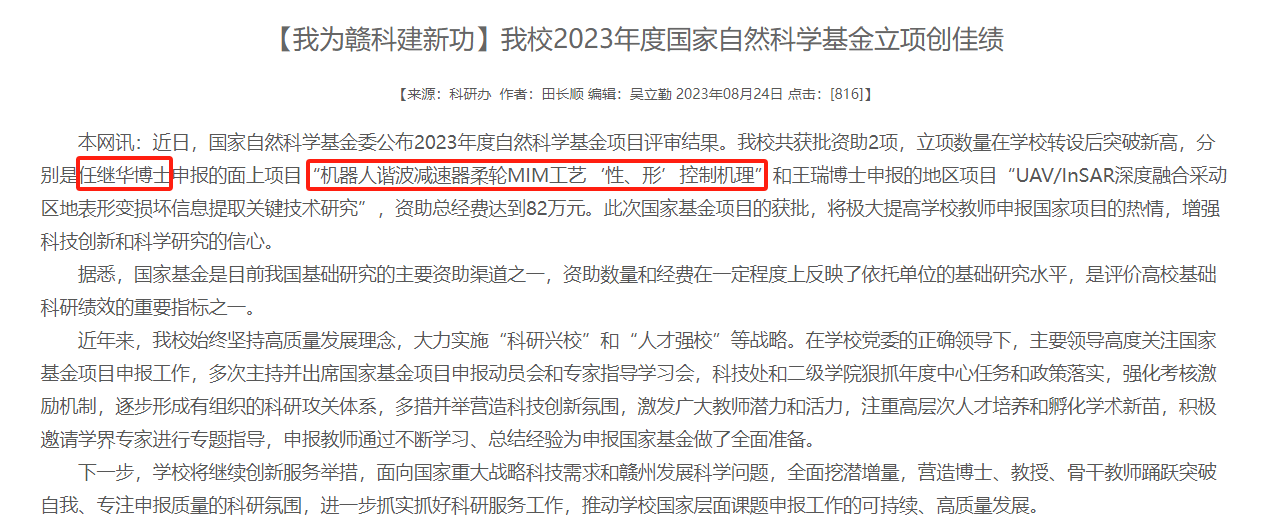 为进一步提高公司产品质量与科研创新能力,11月3日,“精密传动系统科研创新团队”建设启动会在工程研究院S416A会议室召开。国家自然科学基金委公布2023年度自然科学基金项目评审结果。公司共获批资助2项,立项数量在公司转设后突破新高,分别是任继华博士申报的面上项目“机器人谐波减速器柔轮MIM工艺‘性、形’控制机理”和王瑞博士申报的地区项目“UAV/InSAR深度融合采动区地表形变损坏信息提取关键技术研究”,资助总经费达到82万元。此次国家基金项目的获批,将极大提高公司教师申报国家项目的热情,增强科技创新和科学研究的信心。