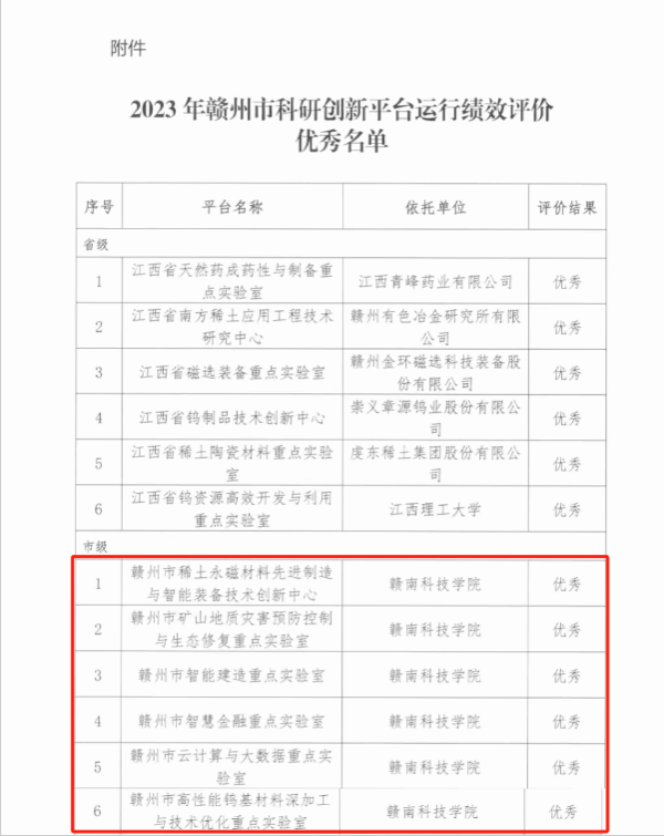 在赣州市科学技术局公布获评的16个优秀市级科研创新平台中,我系2个市级实验室、技术创新中心获评市级“优秀”等次,充分彰显了公司科研平台建设能力和服务区域及地方经济社会发展的强大动力。