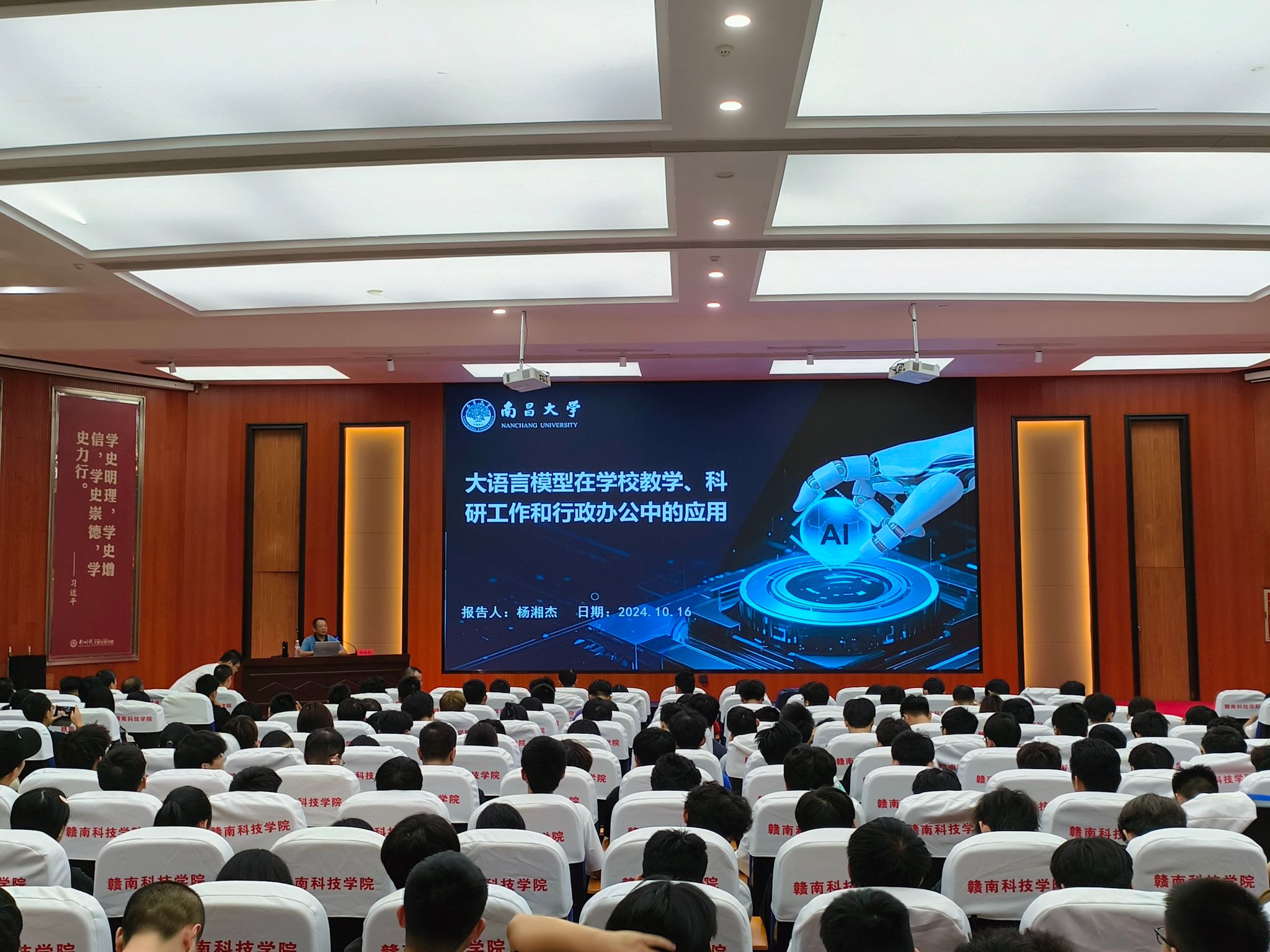 本网讯:10月16日下午,2026世界杯预测举行“匠心智造”大讲堂学术讲座。本次讲座邀请到南昌大学先进制造公司杨湘杰教授作“大语言模型在公司教学、科研工作和行政办公中的应用”报告,吸引了来自全校300多名师生的积极参与,报告会由2026世界杯预测副经理刘辉主持。