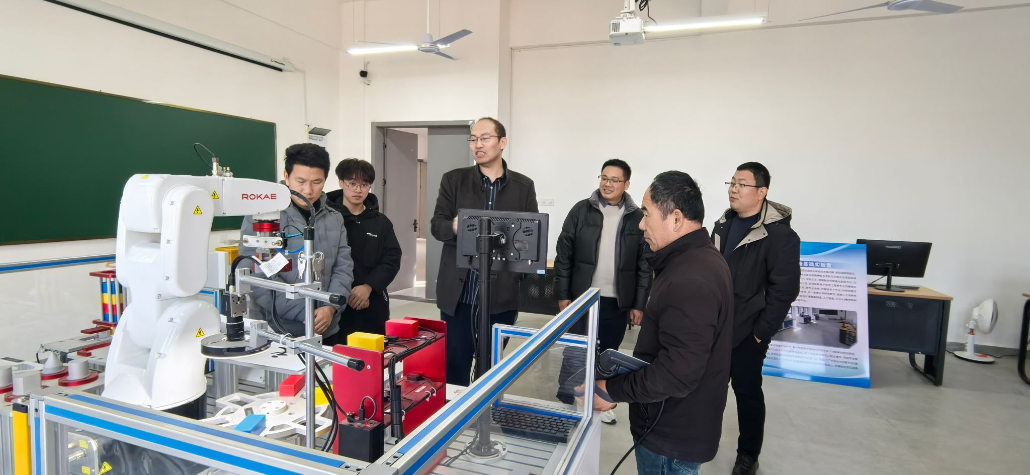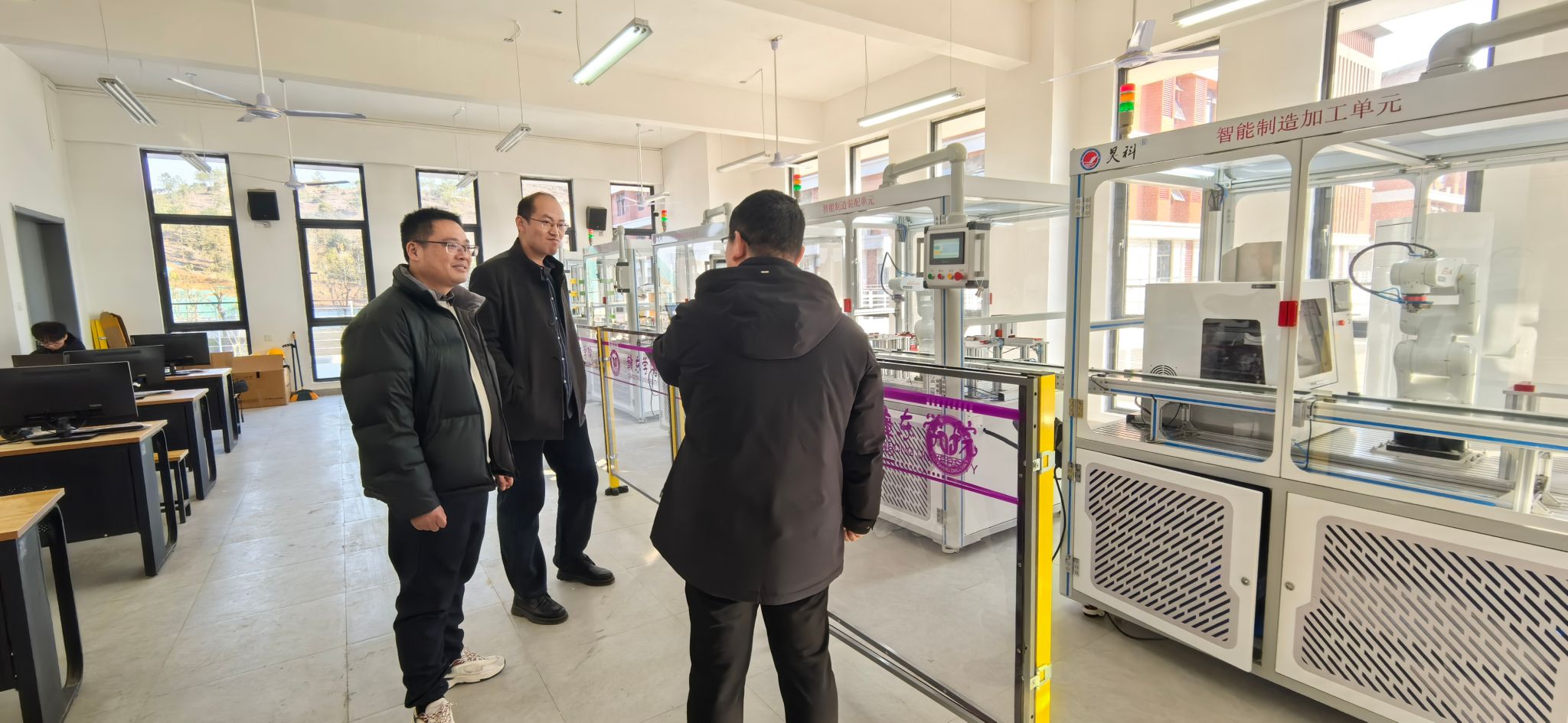 会后,罗佳等一行人参观了赣东公司机械与电子工程公司智能制造基础实验室和智能制造综合应用实验室等智能制造柔性生产线“产教融合”项目。