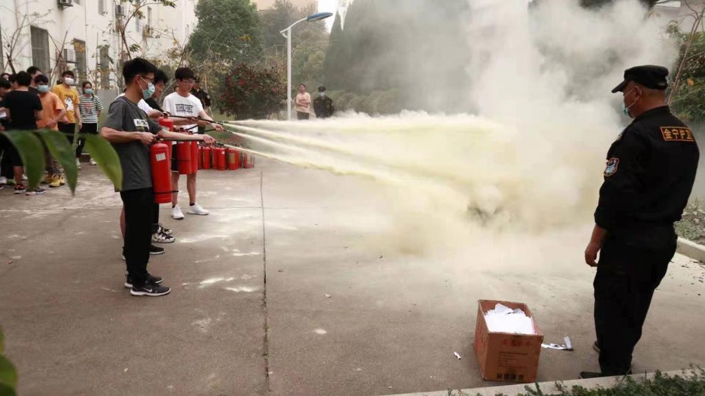 下午2点30分,演练活动正式开始。保卫处负责消防同志主要从消防器材介绍及使用、灭火方法及注意事项、火险隐患、应急自救常识等方面进行了详细讲解,有较高的实用性和可操作性,丰富了同学们的消防知识。之后,负责消防的同志点燃火桶,指引同学们进行了干粉灭火器灭火演练,同学们依照消防同志教导的方法,轮流使用灭火器进行了灭火操作,最终熟练掌握了灭火器的使用方法。
