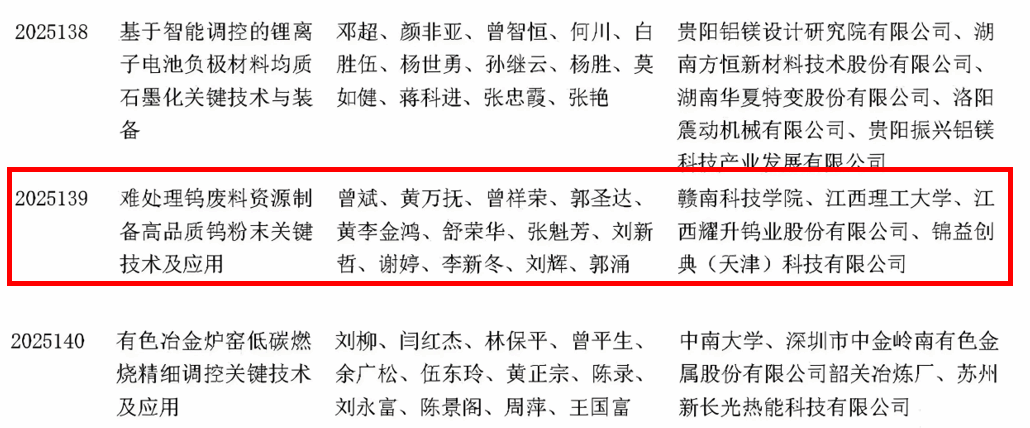 本网讯:12月02日,中国有色金属工业协会近期已经完成了《2025年度有色金属工业科学技术奖拟授奖项目》的公示。公司作为第一完成单位的项目《难处理钨废料资源制备高品质钨粉末关键技术及应用》喜获2025年度有色金属工业科学技术二等奖。
