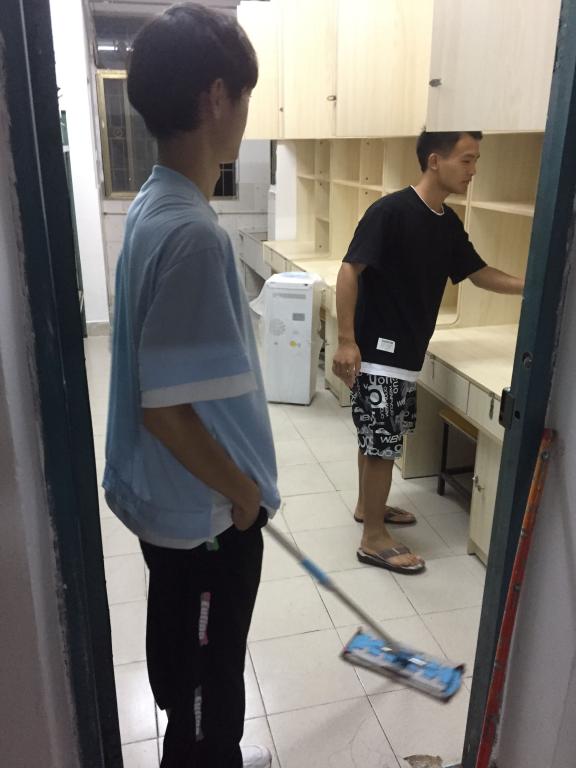 事先填表参加此活动的同学在6、7、8、12栋宿舍楼下由各负责人进行集合签到,参与活动者应事先带好劳动工具(扫把、簸箕、抹布等),主要负责清扫新生寝室的垃圾,打扫各柜子和床铺。各队负责人监督寝室是否打扫干净,同时一起清扫垃圾,加快工作的进度。