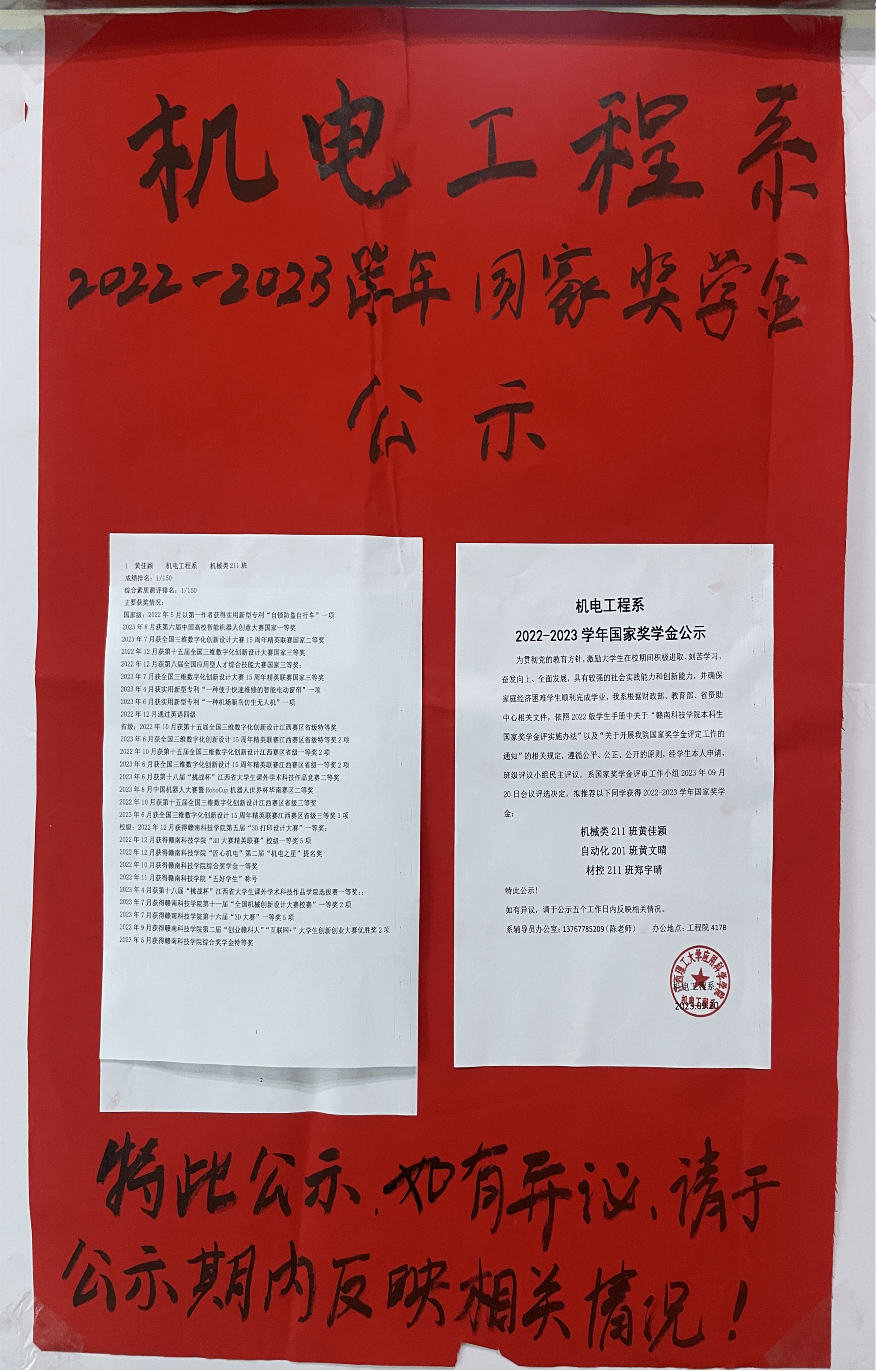 公示时间:2023年9月20日——2023年9月24日。如有异议,请向系国家奖学金评审工作小组反映或致电:13767785209(陈老师)。