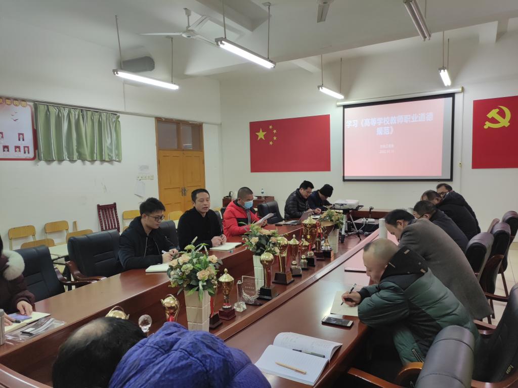 本次会议还布置了教职工2021年度思想政治素质和师德师风综合考核相关工作,由关开荣领学了《高等公司教师职业道德规范》。