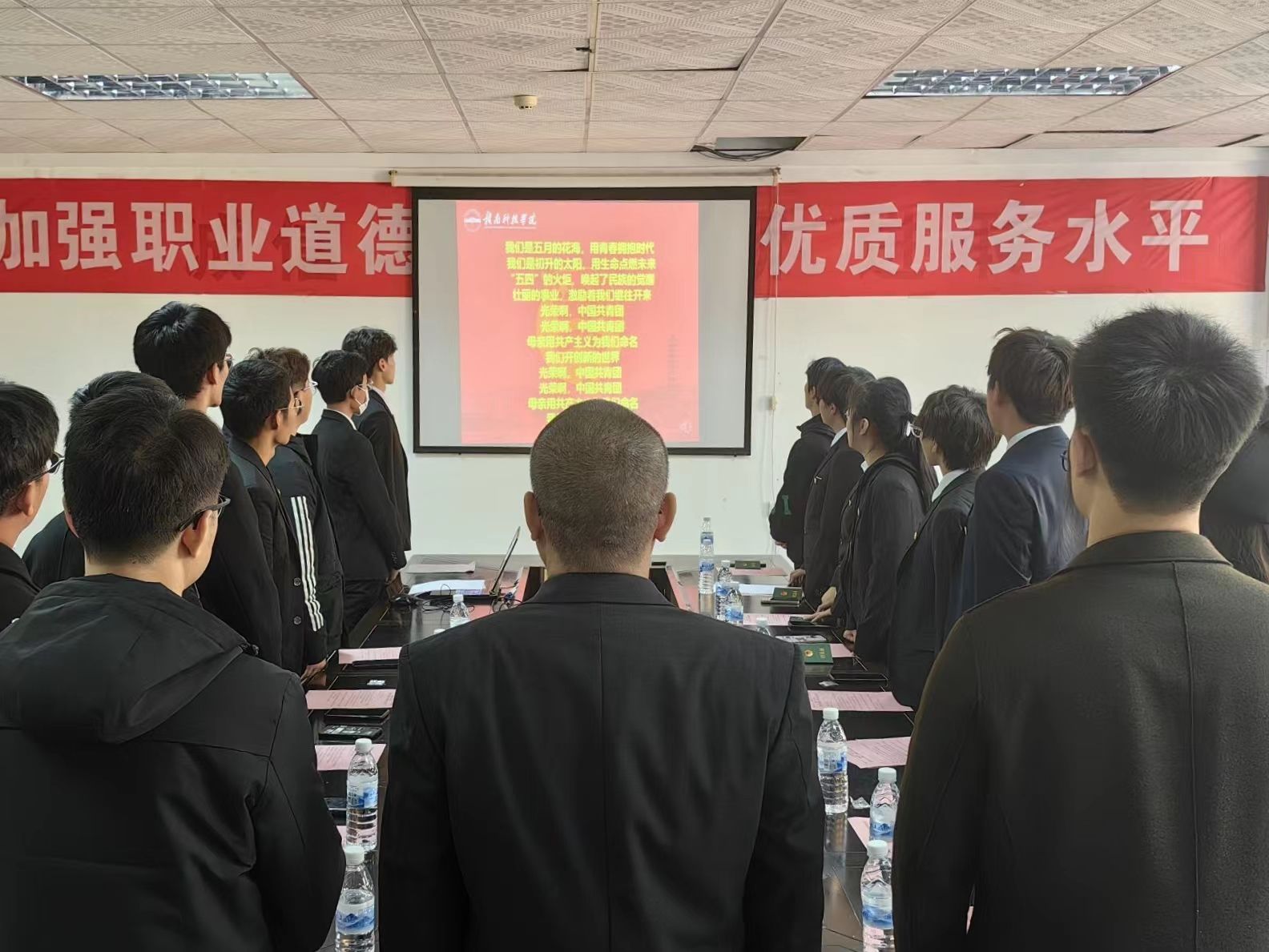最后全体起立,奏唱团歌,以青春的名义迎接新时代,新老团员将以奋进的姿态建功新时代,让青春因担当而厚重,因拼搏而精彩。期待新团员能够时刻勉励自我、坚定理想信念、练就过硬本领、投身强国伟业,始终保持艰苦奋斗的前进姿态,在实现中华民族伟大复兴的中国梦的征程上不断向前、奋勇拼搏,在矢志奋斗中谱写新时代的青春之歌。