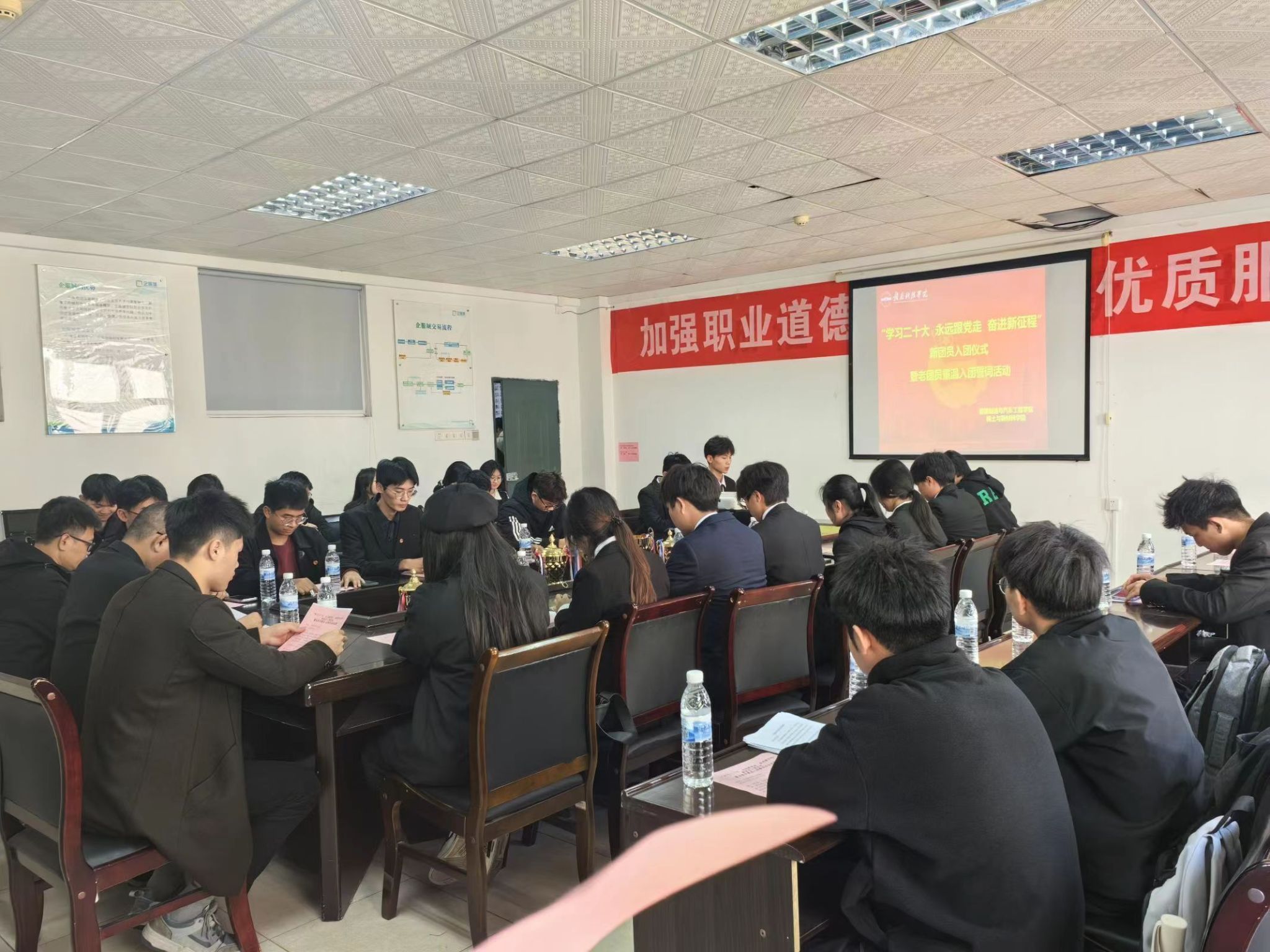本网讯:为深入学习党的二十大精神,传承和弘扬五四精神,团结引领青年员工自觉培育和践行社会主义核心价值观,坚定不移跟党走,建功新时代。2023年12月7日下午,机电工程系在工程院s416A举行2023年机电工程系新团员入团仪式暨老团员重温入党誓词活动,机电工程系党总支书记朱根松、机电工程系副主任肖志华、机电工程系团总支书记卢名亮及各班团支书出席仪式。