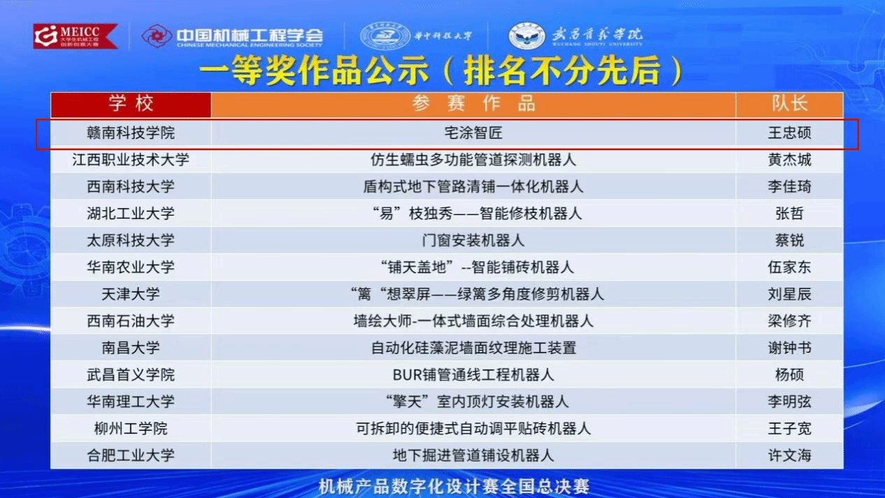 本网讯:11月8日-9日,2024年中国老员工机械工程创新创意大赛——机械产品数字化设计赛全国现场总结赛在武汉华中科技大学隆重举办。本次比赛吸引了来自同济大学、华中科技大学等全国几百所高校参赛,公司学子王忠硕,黄骏、熊丽芸设计的《宅涂智匠》(指导老师:黄伟玲、徐支凤)荣获全国一等奖,阮恢如、熊江洋、邱健所设计的作品《美缝机器人》(指导老师:徐支凤、黄伟玲)荣获全国二等奖,开创了公司学子首次参赛并荣获两项国家级奖项的辉煌记录。这一佳绩也让公司在全国高校中崭露头角,极大提升了公司的知名度和影响力。
