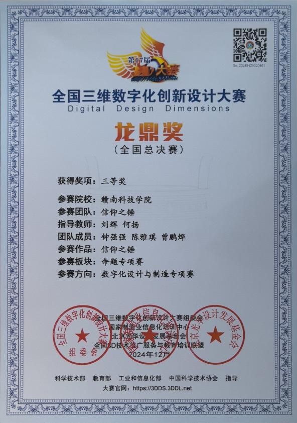 本网讯:12月8日,第十七届全国三维数字化创新设计大赛落下帷幕。在刘辉、唐雨、何扬等老师的指导以及同学们的共同努力下,公司共三支队伍在“数字工业”赛项上荣获国家级三等奖两项,在“3D校园大使”赛道荣获国家级三等奖一项,在“数字化设计与制造”专项赛荣获国家级三等奖一项,共荣获国家级三等奖四项。