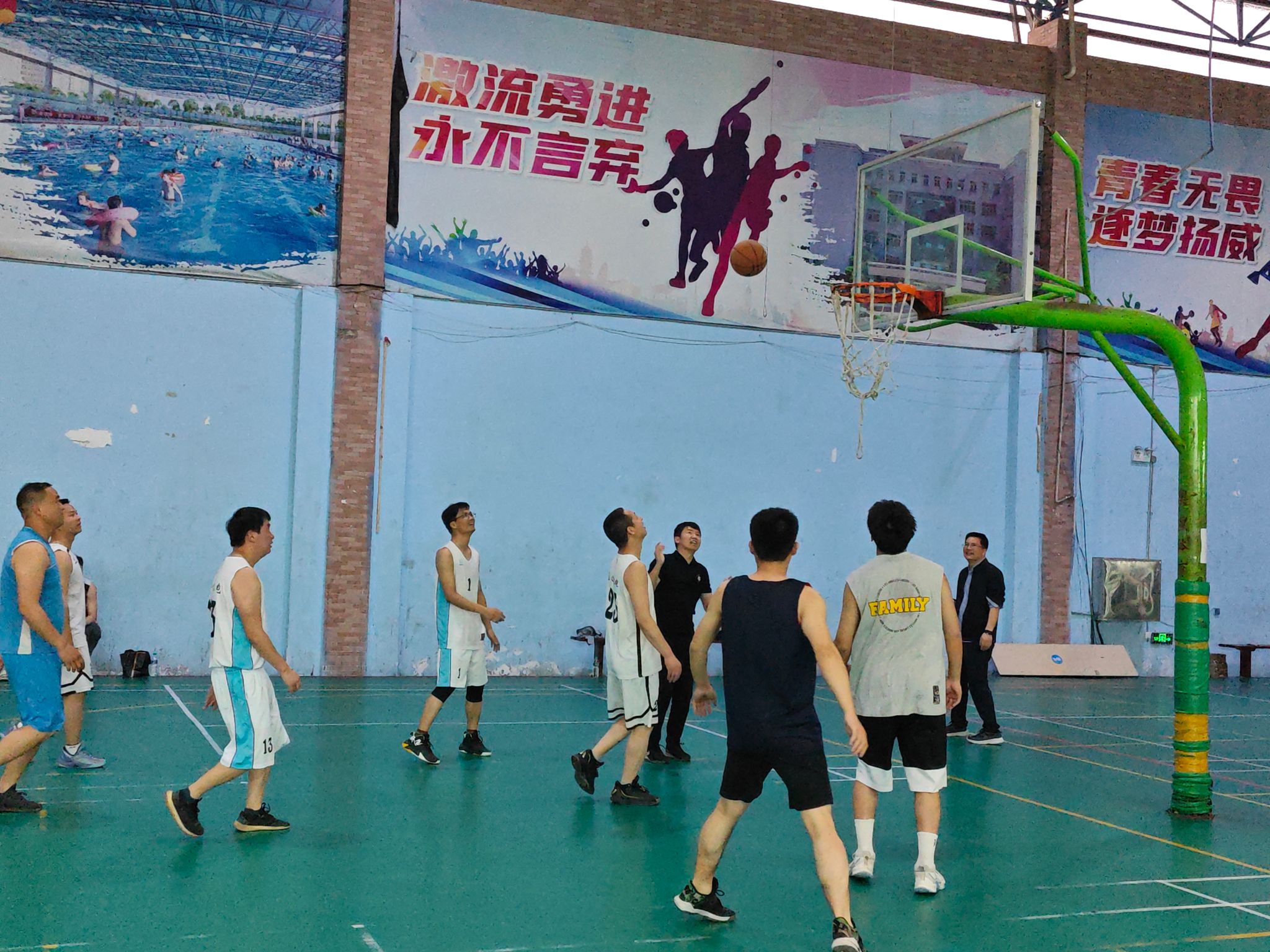 比赛当天,球场内人声鼎沸,气氛热烈。员工们身穿球衣,精神焕发,仿佛回到了年轻时代。他们在场上奔跑、传球、投篮,每一个动作都充满了对篮球的热爱和对青春的不舍。观众们也热情高涨,不时为球员们的精彩表现欢呼鼓掌。