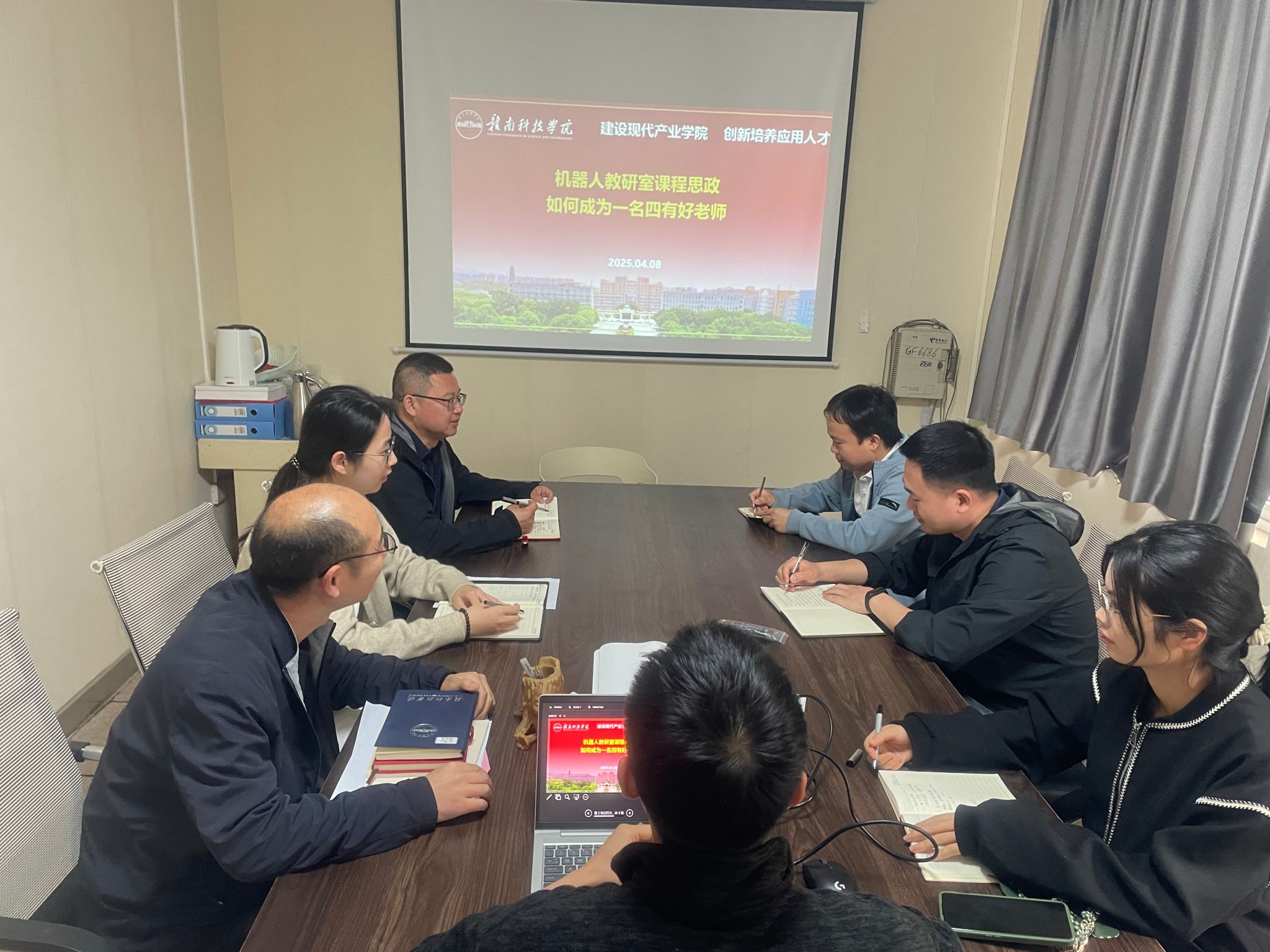 会上,机器人教研室主任高威结合多年的教学实践,分享了自己的宝贵经验和心得。他提出,机器人技术的高速发展对教师综合素养提出了更高要求,教师需将“四有”标准融入教学全过程,既要在专业领域深耕细作,又要在课程中渗透家国情怀与工匠精神。与会教师围绕“课程思政与教师角色重塑”“机器人教学中的德育实践路径”“创新教学方法提升育人实效”等议题展开热烈讨论,分享了案例教学、项目式学习等融合思政元素的实践经验。