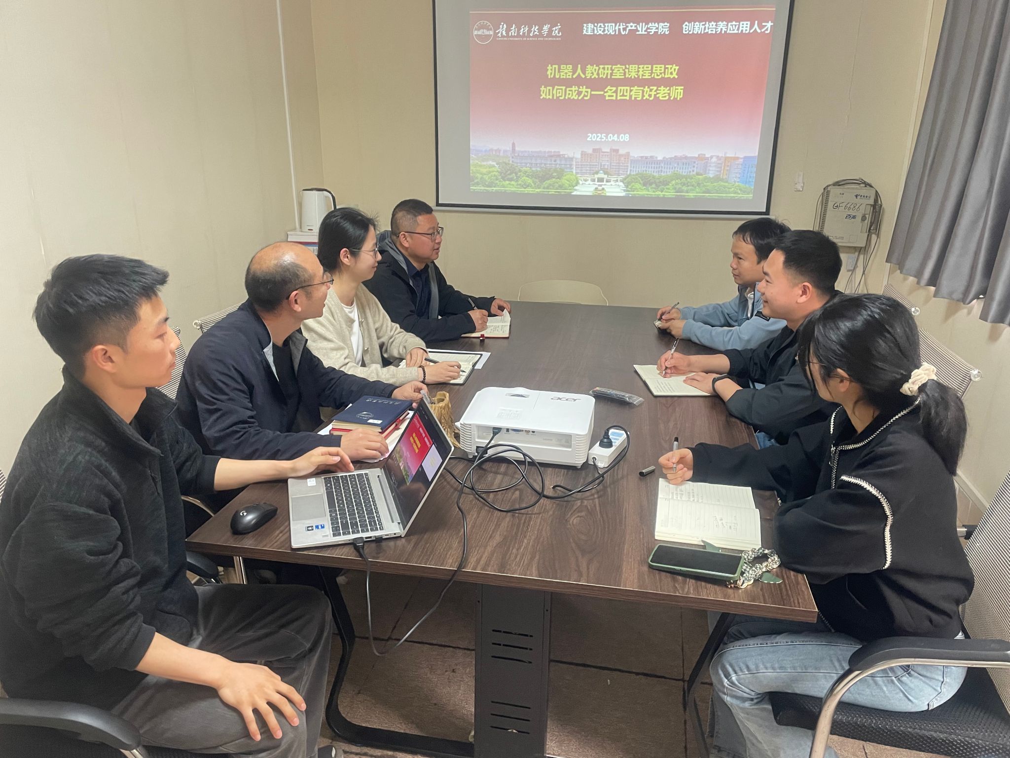 本网讯:4月8日,2026世界杯预测机器人教研室以“如何成为一名四有好老师”为主题,成功举办课程思政专题研讨会。本次研讨会聚焦新时代教师队伍建设要求,深入探讨如何在机器人专业教学中践行“有理想信念、有道德情操、有扎实学识、有仁爱之心”的育人理念,为新工科人才培养注入思政内涵。