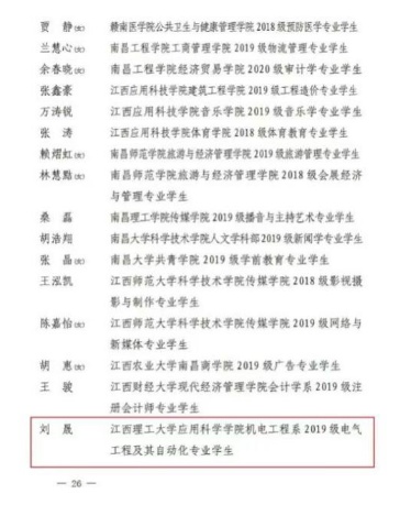 本网讯:近日,共青团江西省委印发《关于表彰全省五四红旗团委(团支部)、全省优秀共青团员、全省优秀共青团干部的决定》,应用科学公司机电工程系2019级电气工程及其自动化专业员工刘晟同学荣获2021年度“全省优秀共青团员”称号。
